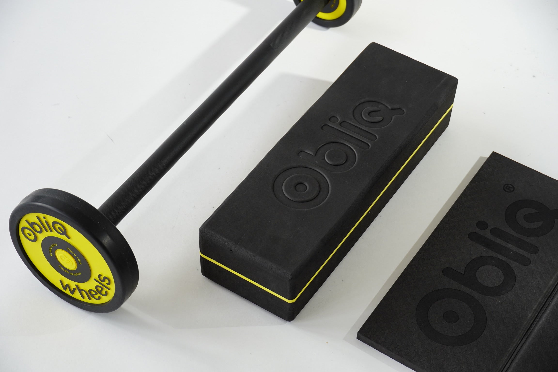 ObliQ Starter Package including an ObliQ wheels, ObliQ starter block, ObliQ knee mat and ObliQ latex resistance band.