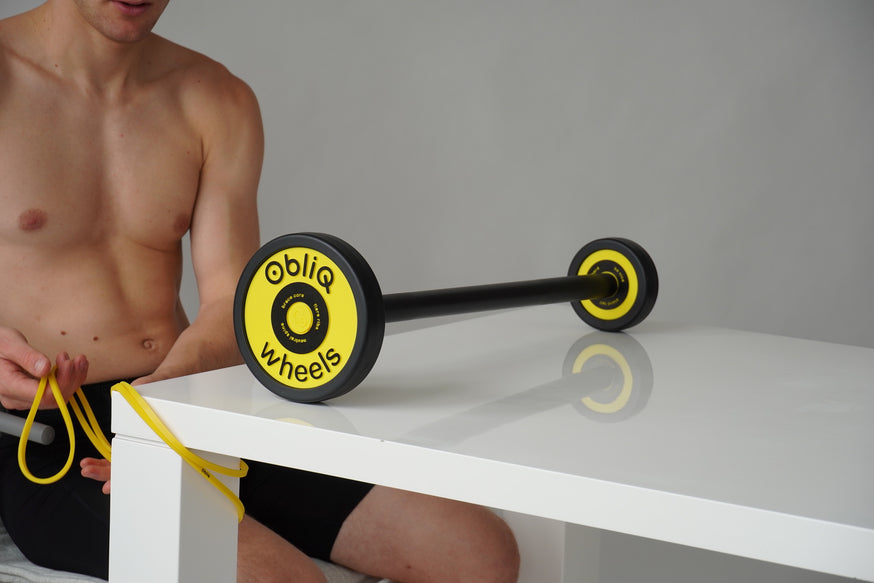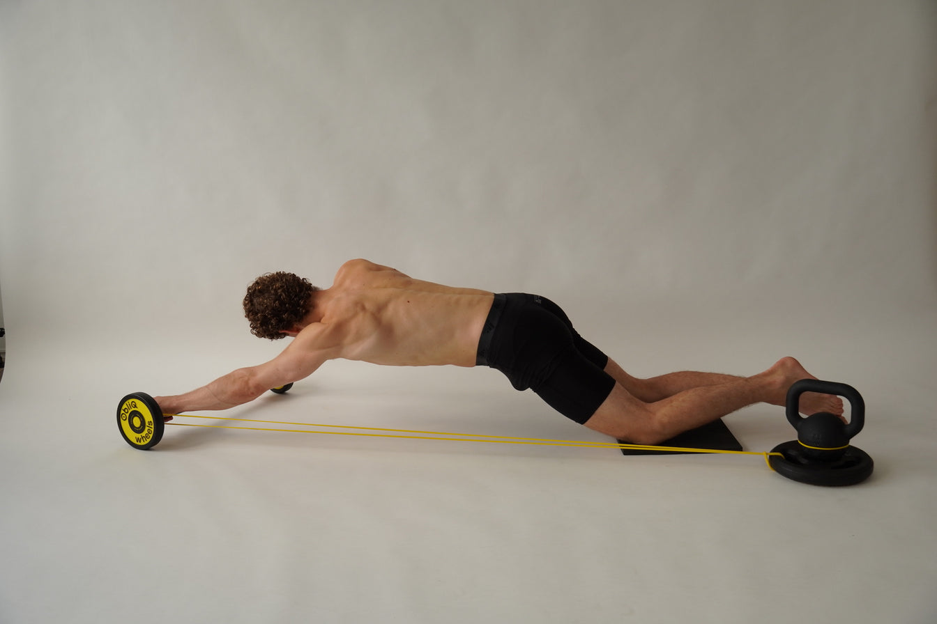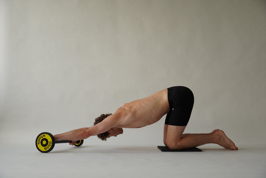 Guided asymmetric roll out exercises with ObliQ Wheels are great for functional eccentric training of the core and the shoulder girdle. Many of us lack shoulder mobility or have an acquired shoulder laxity but miss control in the end range of motion. To help you progress to full shoulder mobility and strength in the end range of motion, we developed several regression exercises that get you rolling independent of your initial shoulder strength or mobility.